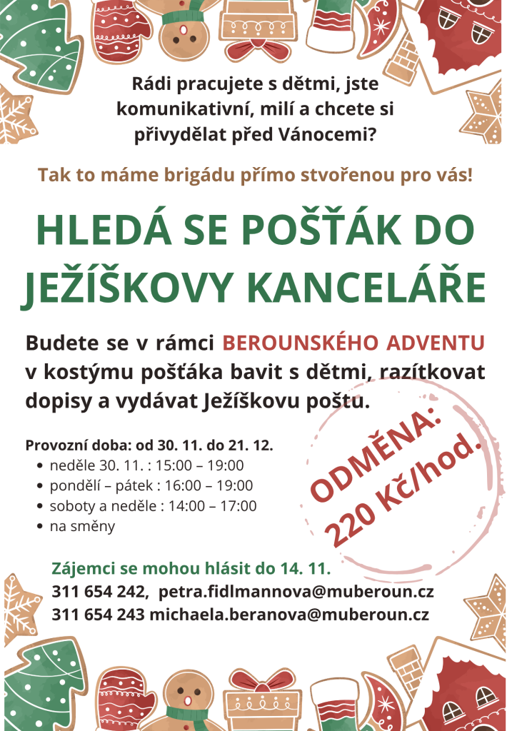 V kostýmu pošťáka budete komunikovat s dětmi, razítkovat a obálkovat dopisy a vydávat Ježíškovu poštu.